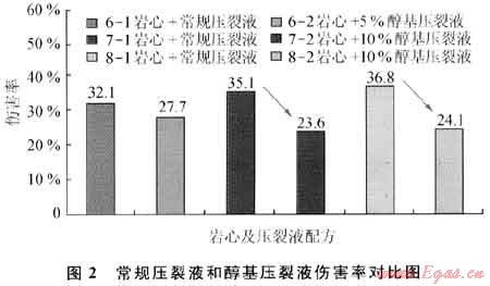 室內(nèi)對研制的醇基壓裂液性能進行實驗評價,結(jié)果表明:①醇基壓裂液的表面張力低于26mN/m,低于水基壓裂液;②防膨率在80%以上,優(yōu)于水基壓裂液;③殘渣含量為462mg/L,低于550mg/L的行業(yè)標準;④用K2X井巖心實驗醇基壓裂液的傷害率在23.65%~27.7%之間,而水基壓裂液的傷害率在32.1%~36.8%之間,可見醇基壓裂液傷害率比常規(guī)壓裂液降低幅度約1/3(圖2);⑤甲醇的加入有利于降低壓裂液的表面張力和黏度,從而有利于壓裂液施后的返排,降低了壓裂液對儲層的傷害。