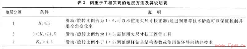 基于上述認識,可進而提出以工程實現(xiàn)能力為依據(jù)的地層分級方法。即根據(jù)井眼尺寸和地層對于鉆井手段的響應(yīng)效果進行分級。例如,在大牛地氣田,根據(jù)地層可鉆性級值,Φ215.9mm井眼可以將地層分為3級(圖3)。地層可鉆性級值(Kd)小于3的可劃分為I級,對應(yīng)的復(fù)合鉆進全角變化率小于3.5°/100m,即復(fù)合鉆進60m,井斜最大增加2.1°,使用1.25°單彎動力鉆具滑動鉆進10m左右即可控制井眼軌跡?;瑒鱼@進與旋轉(zhuǎn)鉆進的比例接近1:6。實際施工中,當(dāng)所鉆地層Kd<3時,可以使用“鉆頭+單彎螺桿動力鉆具+無磁鉆具+……”的常用鉆具組合,通過多次劃眼、控制鉆壓等方法均可有效降低復(fù)合鉆進井段的全角變化率。根據(jù)地層可鉆性級值選擇底部鉆具組合及井眼軌跡控制的方法見表2。