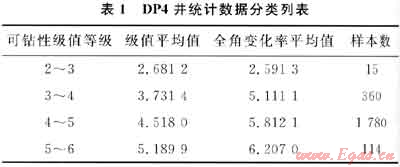 研究分析地層物性條件對水平井井眼軌跡的影響規(guī)律,至少需要解決2個問題:①地層物性條件的標(biāo)識問題,即如何將地層的各種物性特征按照統(tǒng)一標(biāo)準(zhǔn)歸類、分級;②如何建立地層物性條件與井眼姿態(tài)參數(shù)(井斜角、方位角)的對應(yīng)關(guān)系。其中,地層物性條件的標(biāo)識問題可以從眾多的地層可鉆性分級方法中優(yōu)選;而對于第二個問題則可以利用統(tǒng)計分析的方法建立某一區(qū)塊特定鉆具組合在復(fù)合鉆進方式下的鉆進特性與地層物性的統(tǒng)計關(guān)系予以解決。