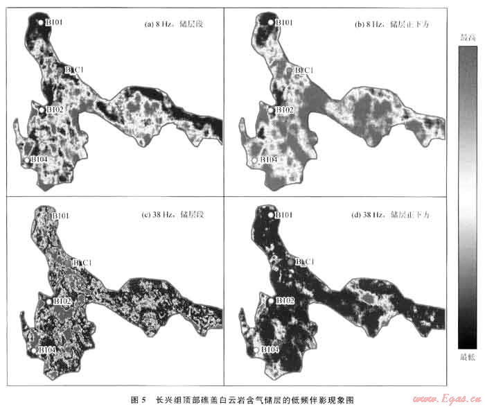 從時頻分析結(jié)果中,在儲層段和儲層段的正下方切取不同頻率的共頻率沿層切片,便可進(jìn)行低頻伴影現(xiàn)象分析。在地震頻率較低時(8Hz),所圈定范圍內(nèi)的含氣儲層的地震反射能量強(qiáng)(紅色區(qū)),其正下方出現(xiàn)相同的強(qiáng)反射能量,這些低頻強(qiáng)能量就是地震低頻伴影;而當(dāng)?shù)卣痤l率為10、12Hz時,低頻能量上強(qiáng)下強(qiáng)的區(qū)域縮小;當(dāng)?shù)卣痤l率為16Hz時,表現(xiàn)為由低頻向中高頻過渡特征;當(dāng)頻率升高,從18、22、28、38Hz變化,有利儲層的地震能量表現(xiàn)為上強(qiáng)下弱特征,沒有地震低頻伴影現(xiàn)象。由此可以推斷所圈定范圍為礁蓋儲層含氣的有利區(qū)域(圖5)。