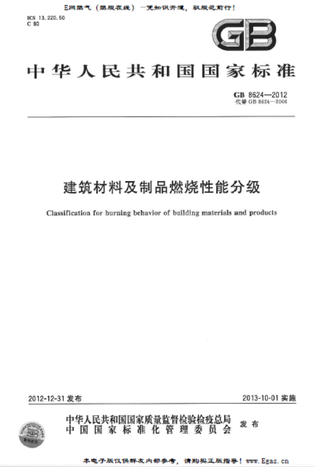 建筑材料及制品燃燒性能分級GB 8624-2012:本標(biāo)準(zhǔn)規(guī)定了建筑材料及制品的術(shù)語和定義、燃燒性能等級、燃燒性能等級判據(jù)、燃燒性能等級標(biāo)識和檢驗報告。