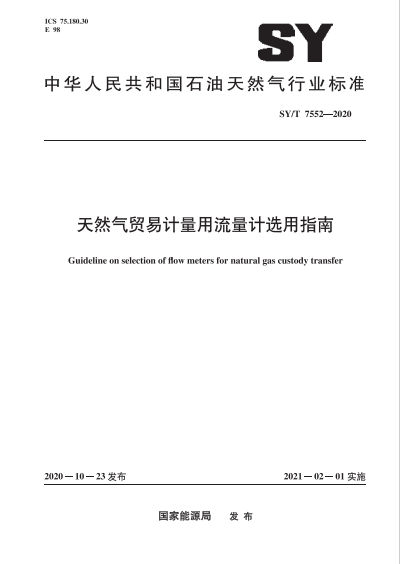 天然氣貿(mào)易計量用流量計選用指南石油天然氣標(biāo)準(zhǔn)∕T 7552-2020