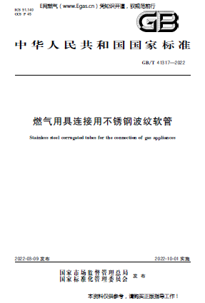燃?xì)庥镁哌B接用不銹鋼波紋軟管GB/T 41317-2022:本文件規(guī)定了使用GB/T 13611規(guī)定的城鎮(zhèn)燃?xì)獾娜細(xì)庥镁哌B接用不銹鋼波紋軟管的分類、規(guī)格和型號(hào),要求,試驗(yàn)方法,檢驗(yàn)規(guī)則以及標(biāo)志、包裝、運(yùn)輸和貯存。