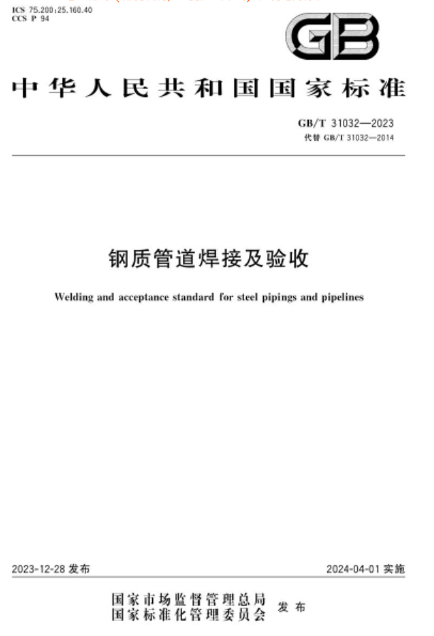 鋼制管道焊接及驗(yàn)收國標(biāo)/T 31032-2023